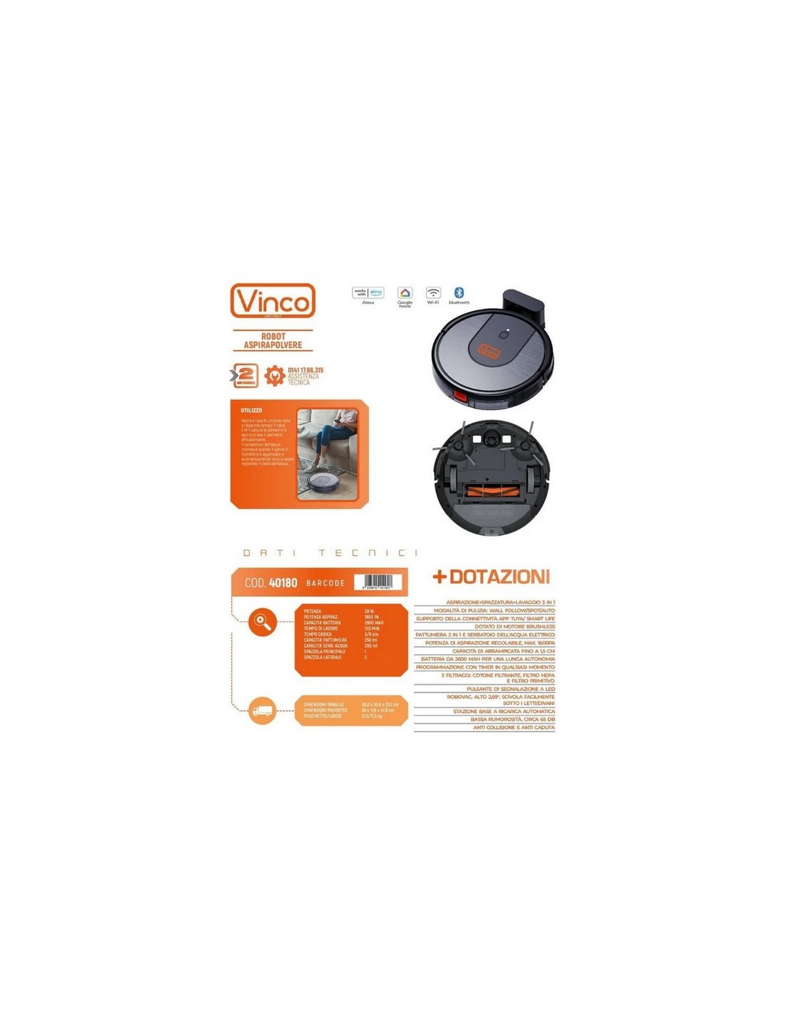 Robot aspirapolvere Vinco con funzione aspirazione, spazzatura e lavaggio 3 in 1. Dotato di motore brushless, potenza di aspirazione regolabile e capacità di arrampicata fino a 1,5CM. Stazione base a ricarica automatica, bassa rumorosità e sistema anti collisione e anti caduta.