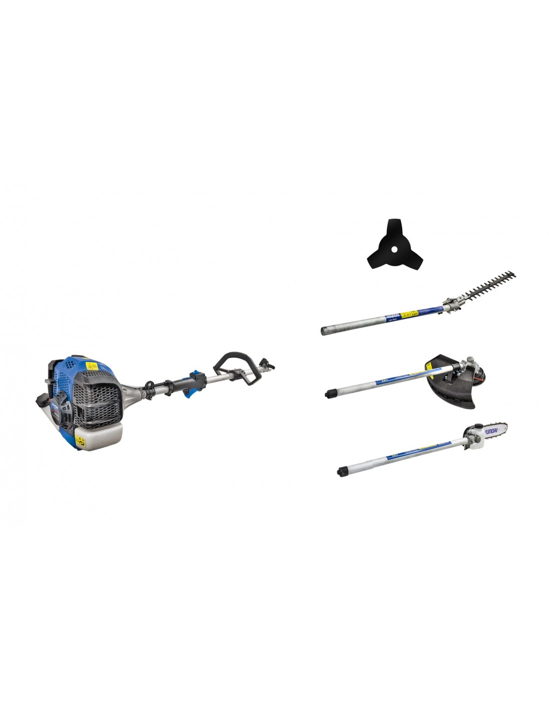 Decespugliatore Hyundai 4 in 1: decespugliatore per erbe, taglio arbusti, tagliasiepi, potatore. Ideale per tutti i lavori di manutenzione di piccoli giardini e frutteti. Basta sostituire il terminale dell’asta con l’accessorio adatto e non è più necessario possedere più attrezzi, ma soltanto uno! Impugnatura ergonomica e diritta ad innesto rapido. L'imballo contiene: 1 decespugliatore, 1 testina a filo in nylon, 1 disco da taglio in acciaio, 1 accessorio motosega potatore, 1 tracolla, set chiavi, 1 tanica per miscela.