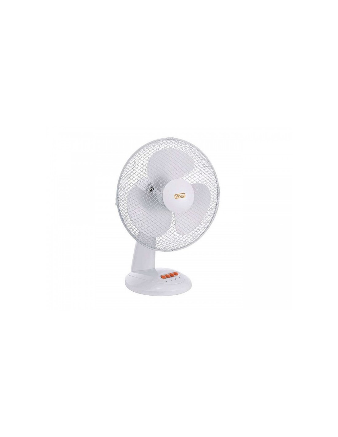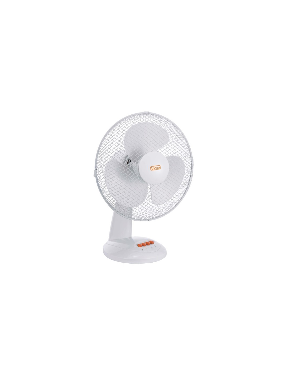 Ventilatore da tavolo Vinco da 45W, 3 pale con diametro pale cm. 40, dotato di 3 velocità, oscillazione laterale. Colore bianco, griglia di copertura in metallo colore bianco, tasti selezione velocità soft touch, altezza cm. 43,5. La soluzione ideale per rinfrescare l’aria di piccoli ambienti, occupando uno spazio molto limitato. L’imballo contiene: 1 ventilatore