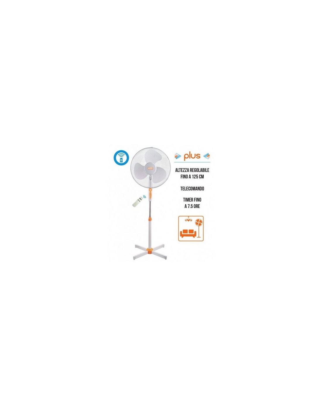 Ventilatore a piantana Vinco da 45W, base a crociera, altezza regolabile fino ad un massimo di 125 cm, 3 pale con diametro cm. 40. Colore bianco, griglia di copertura in metallo colore bianco, oscillazione laterale. Telecomando a infrarossi in dotazione (batterie non incluse). Grazie al pratico Timer (h. max) digitale è possibile impostare il funzionamento fino a 7,5 ore. Una soluzione per ambienti di lavoro e relax che permette massima flessibilità d’uso e flusso d’aria all’altezza desiderata. L’imballo contiene: 1 ventilatore