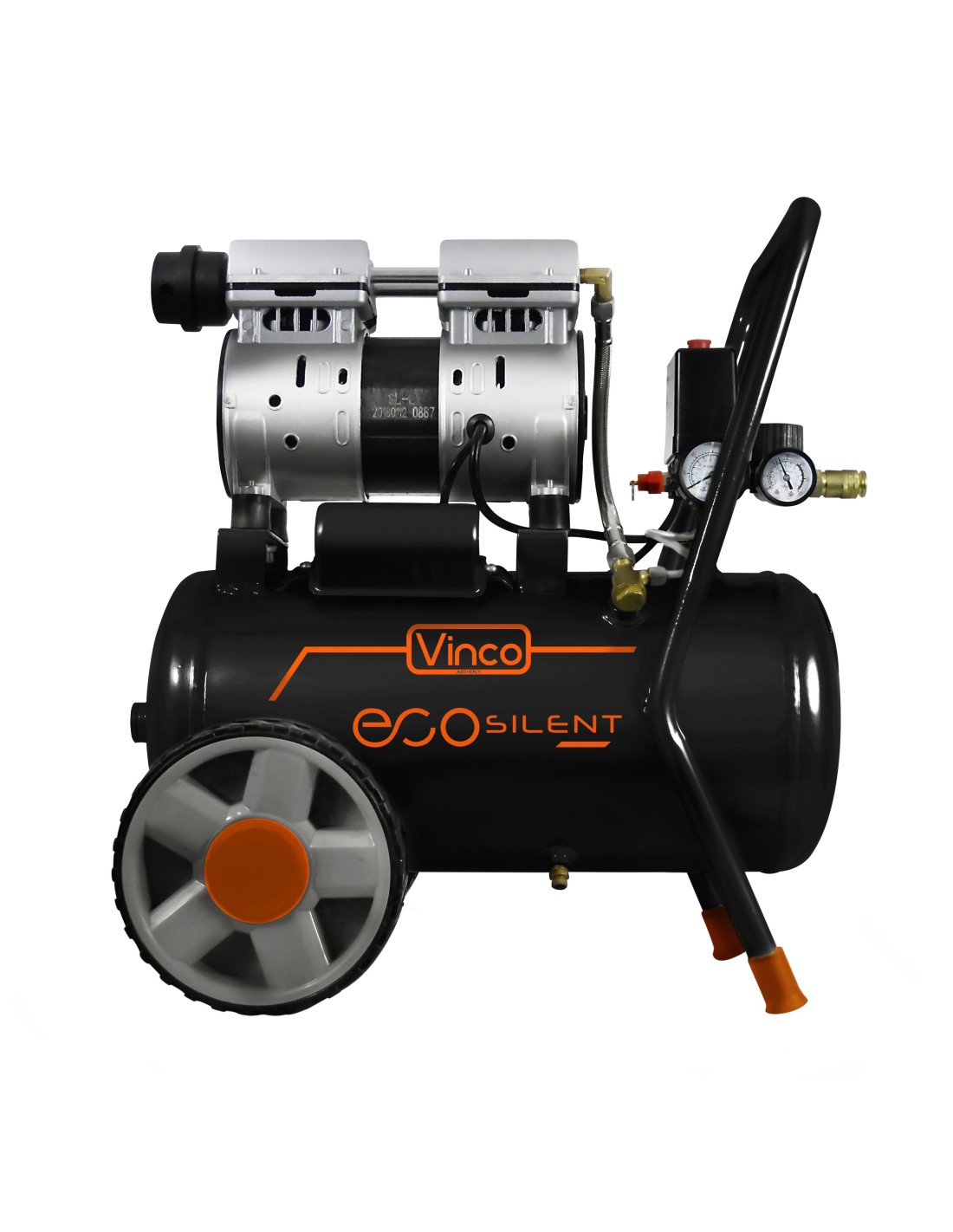 Compressore d’aria Vinco silenziato 59 dB oil-less motore bicilindrico da 24l, maneggevole ideale per usi casalinghi e hobbistici e semi-professionali quali soffiaggio, gonfiaggio, pittura ad aerografo, uso di attrezzi ad aria compressa, lavori di verniciatura ma anche in campo medico, dentistico, alimentare grazie alle emissioni di aria prive di oli e quindi più pulite. Dotato di maniglia “comfort”, doppio manometro, 2 supporti antivibrazione anteriori + 2 ruote maggiorate per una stabilità al top della categoria, pressostato. L’imballo contiene: 1 compressore d’aria – 1 filtro