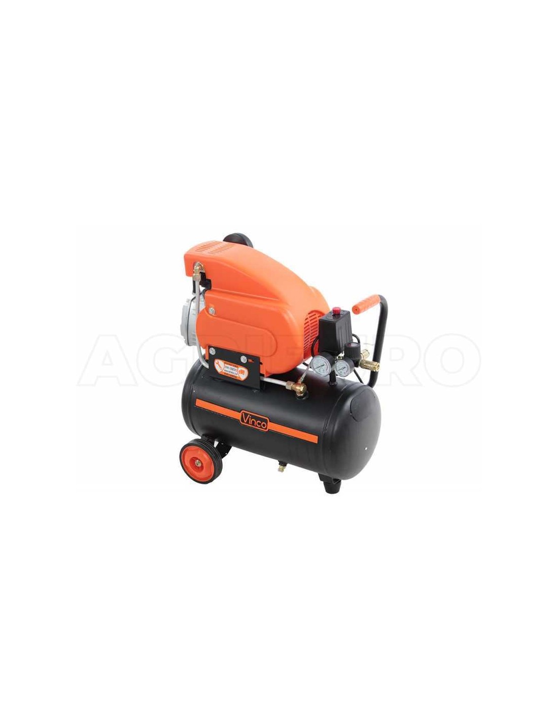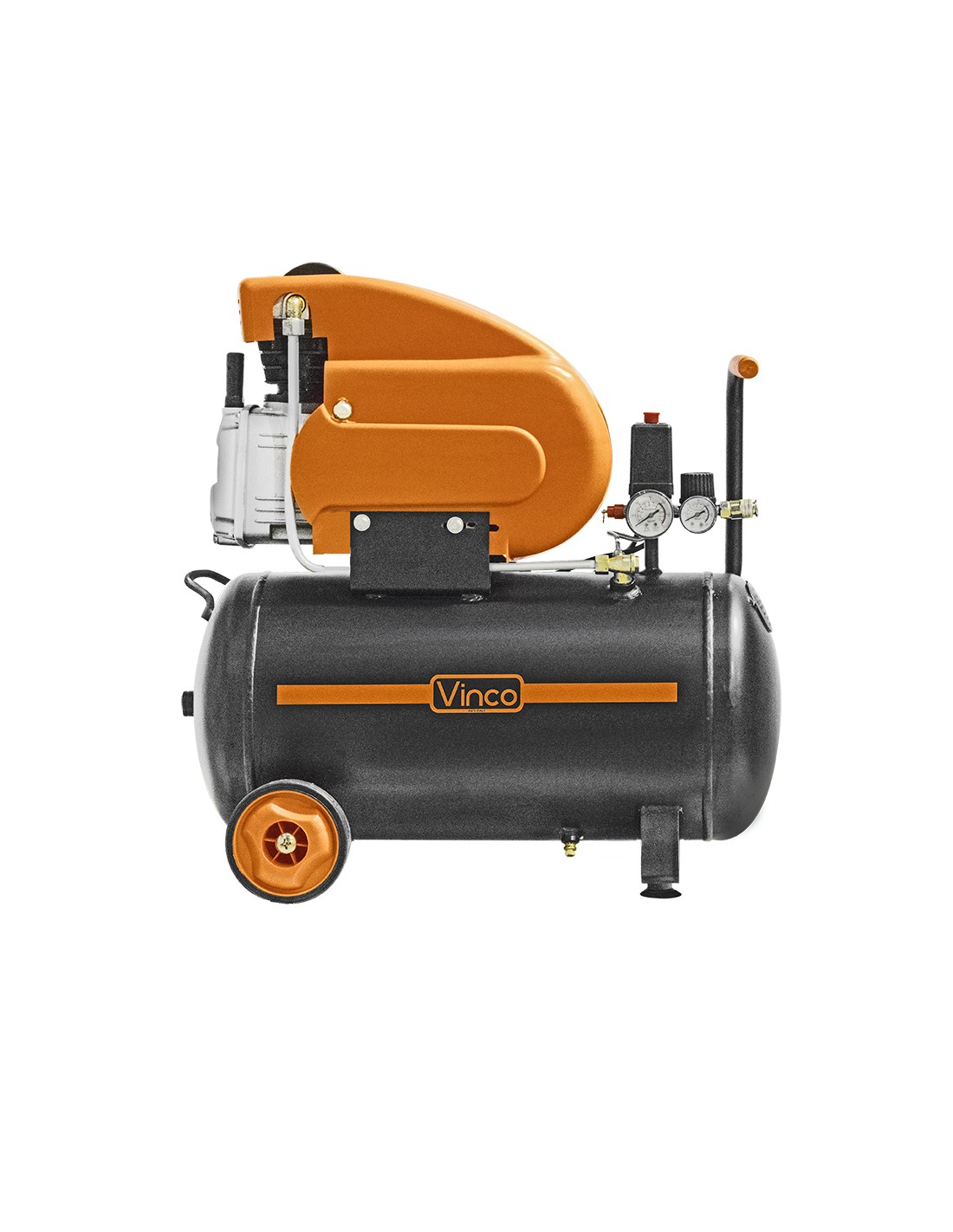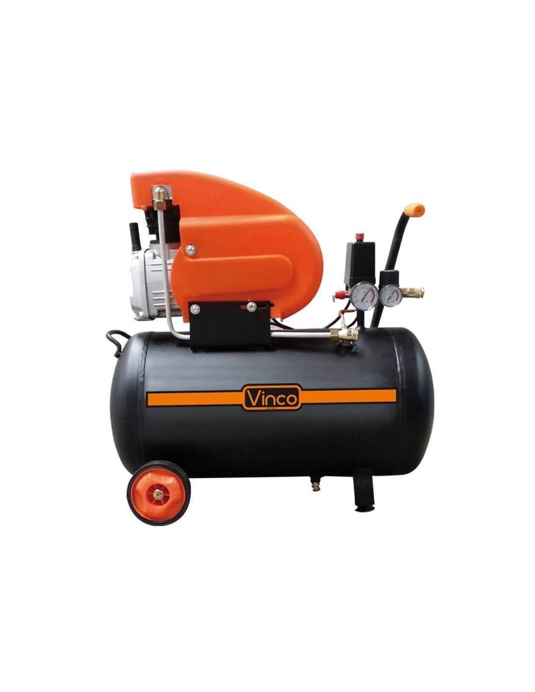 Compressore d’aria Vinco lubrificato da 24l, maneggevole ideale per usi casalinghi e hobbistici e semi-professionali quali soffiaggio, gonfiaggio, pittura ad aerografo, uso di attrezzi ad aria compressa e lavori di verniciatura. Dotato di spia livello olio, doppio manometro, supporto antivibrazione anteriore + 2 ruote, spia livello olio, pressostato. L’imballo contiene: 1 compressore d’aria – 1 filtro