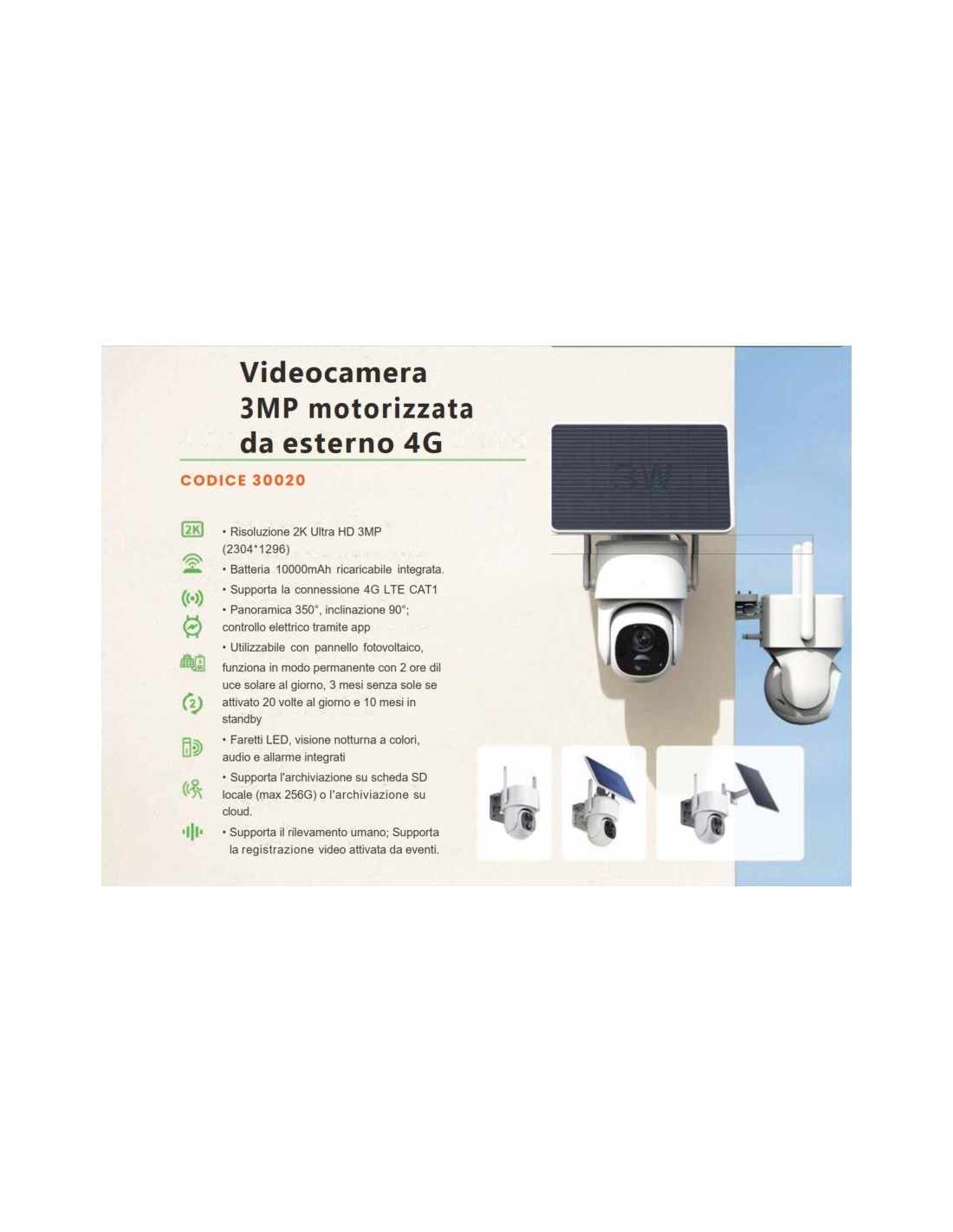 Telecamera motorizzata ideale per ambienti all'aperto dove non è presente l'alimentazione diretta. Fornita con pannello fotovoltaico, possibilità di installazione direttamente sulla telecamera oppure a fianco o alimentazione diretta. Visuale notturna ad infrarossi, con funzione audio e rilevazione movimento.