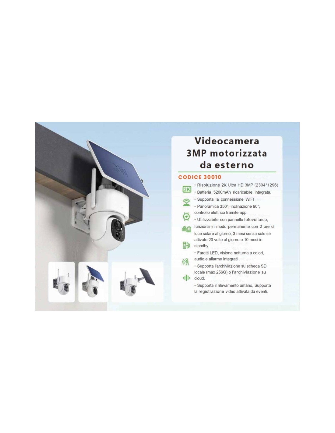 Telecamera motorizzata ideale per ambienti all'aperto dove non è presente l'alimentazione diretta. Fornita con pannello fotovoltaico, possibilità di installazione direttamente sulla telecamera oppure a fianco o alimentazione diretta. Visuale notturna ad infrarossi, con funzione audio e rilevazione movimento.