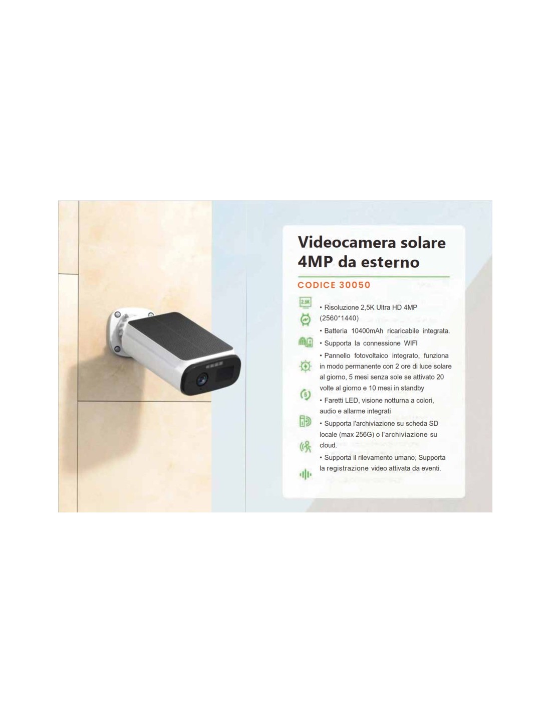 Telecamera motorizzata ideale per ambienti all'aperto dove non è presente l'alimentazione diretta. Fornita con pannello fotovoltaico, possibilità di installazione direttamente sulla telecamera oppure a fianco o alimentazione diretta. Visuale notturna ad infrarossi, con funzione audio e rilevazione movimento.